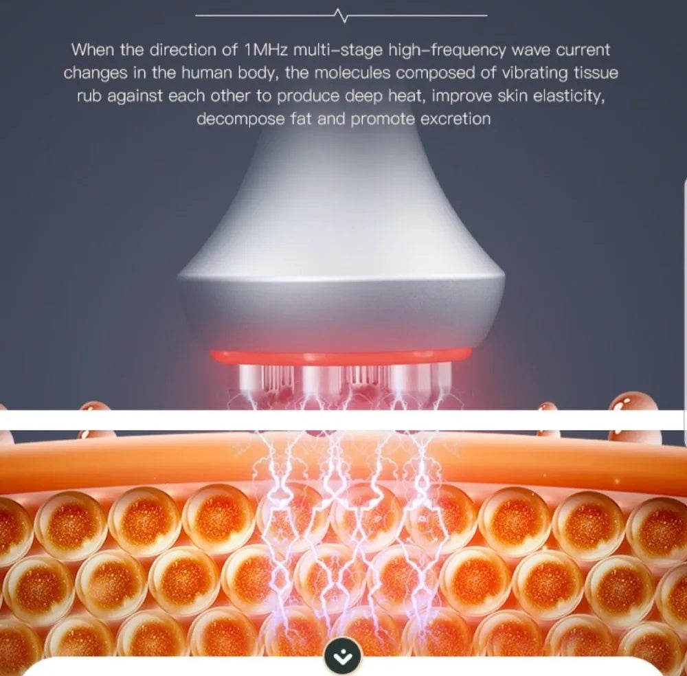 Wibracje wysokiej częstotliwości rozbijają komórki tłuszczowe i wprowadzają preparaty modelujące, powodując wewnętrzne pękanie komórek tłuszczowych i kształtowanie sylwetki.