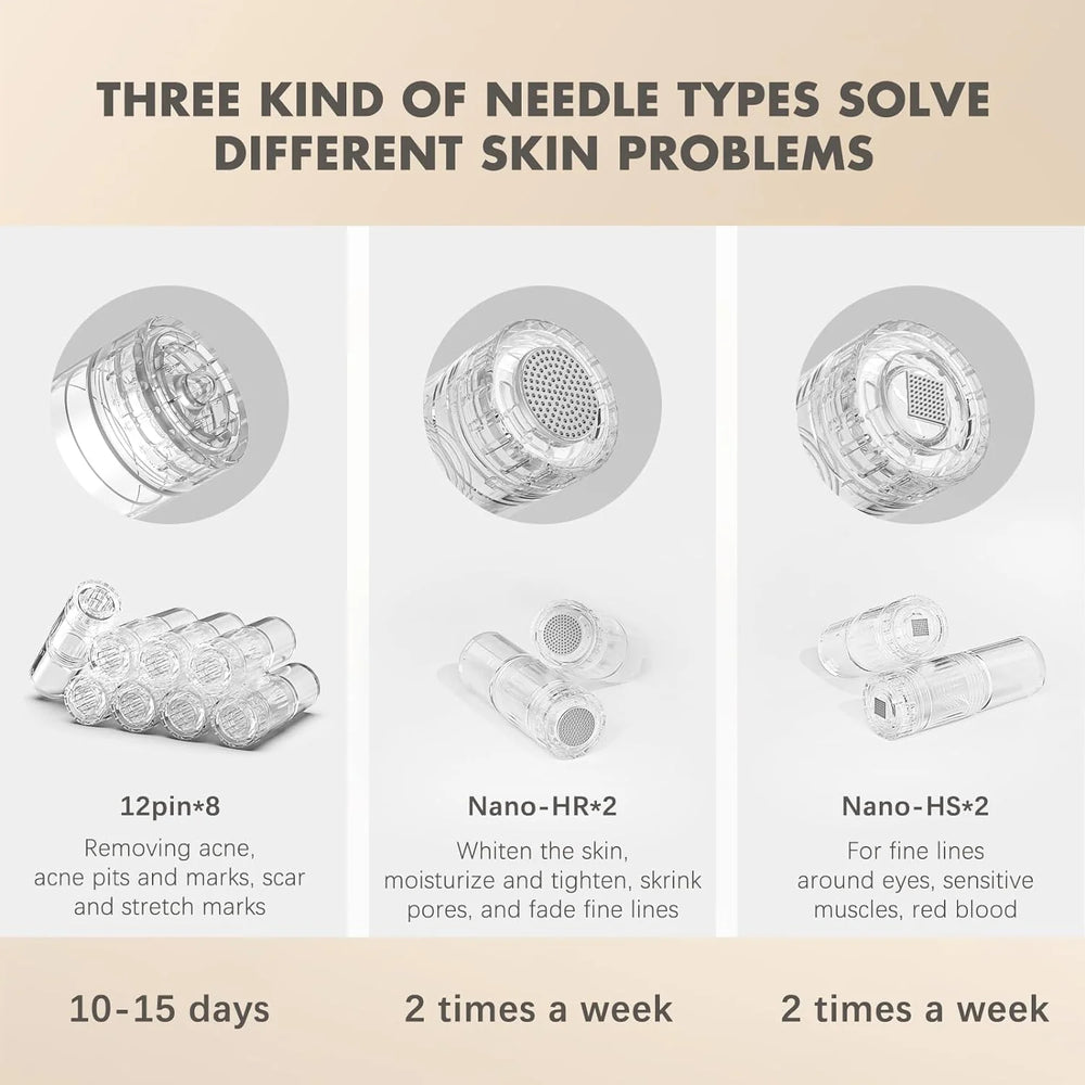 Wymienne kartridże igłowe: Do wyboru 12-igłowe i nano kartridże, odpowiednie do usuwania trądziku, rozjaśniania skóry, nawilżania, napinania i redukcji zmarszczek.
