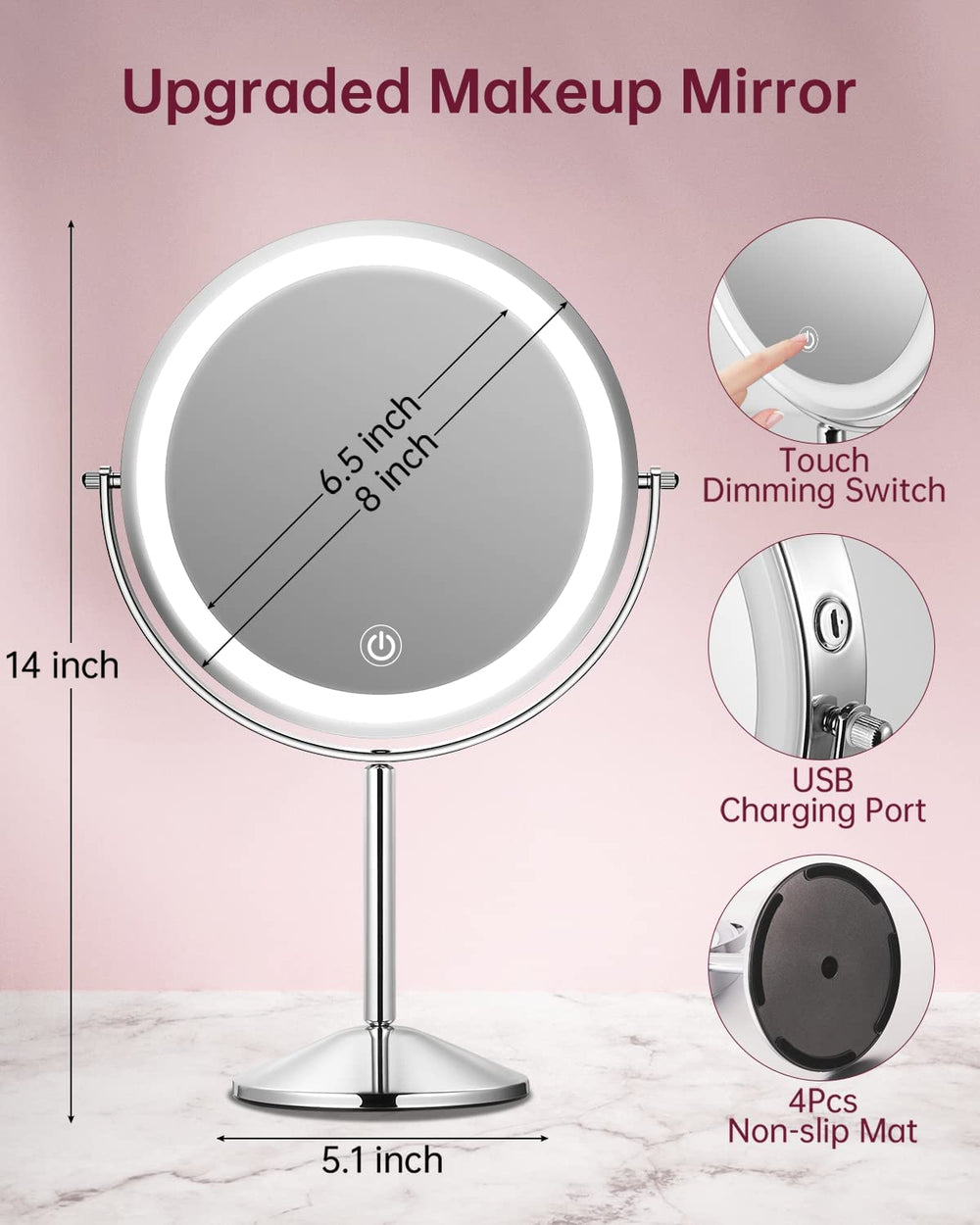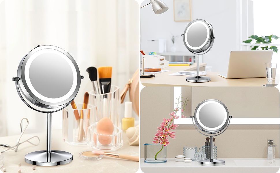 Podświetlane lusterko do makijażu na biurko ma 3 poziomy ściemniania: Krótko naciśnij przełącznik czujnika, aby włączyć/wyłączyć światło. Naciśnij długo, aby dostosować jasność, aby spełnić wszystkie Twoje potrzeby w różnych okolicznościach. to lustro na biurko ma funkcję pamięci, zapamięta ostatnią potrzebną jasność.