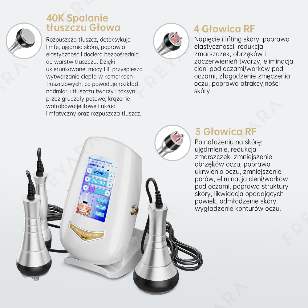 Głowica ultradźwiękowa 40K może wydawać dźwięk podczas pracy, ale to efekt niezwykle precyzyjnych wibracji ultradźwiękowych, które rozbijają tłuszcz z chirurgiczną dokładnością. Cud nowoczesnej nauki! Dodatkowo zaawansowana technologia RF działa głęboko w skórze, zapewniając widoczny efekt odmłodzenia i ujędrnienia.