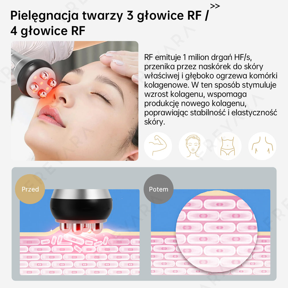 【3 w 1】Wyposażone w 3 różne głowice masujące, pełny zestaw programów dla wszystkich typów skóry i partii ciała, aby sprostać potrzebom pielęgnacji ciała, ujędrniania skóry, redukcji tłuszczu, pobudzania metabolizmu itp.