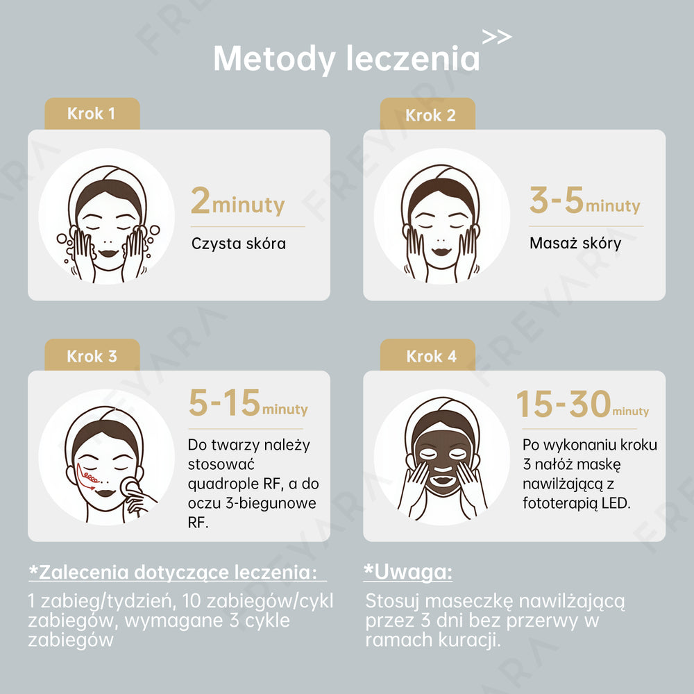 (1) Równomiernie nałóż produkt na twarz, użyj głowicy RF twarzy, działaj od dołu do góry, aby podnieść twarz, spraw, aby skóra była w stanie napiętym, zaleca się stosowanie przez 5 minut;