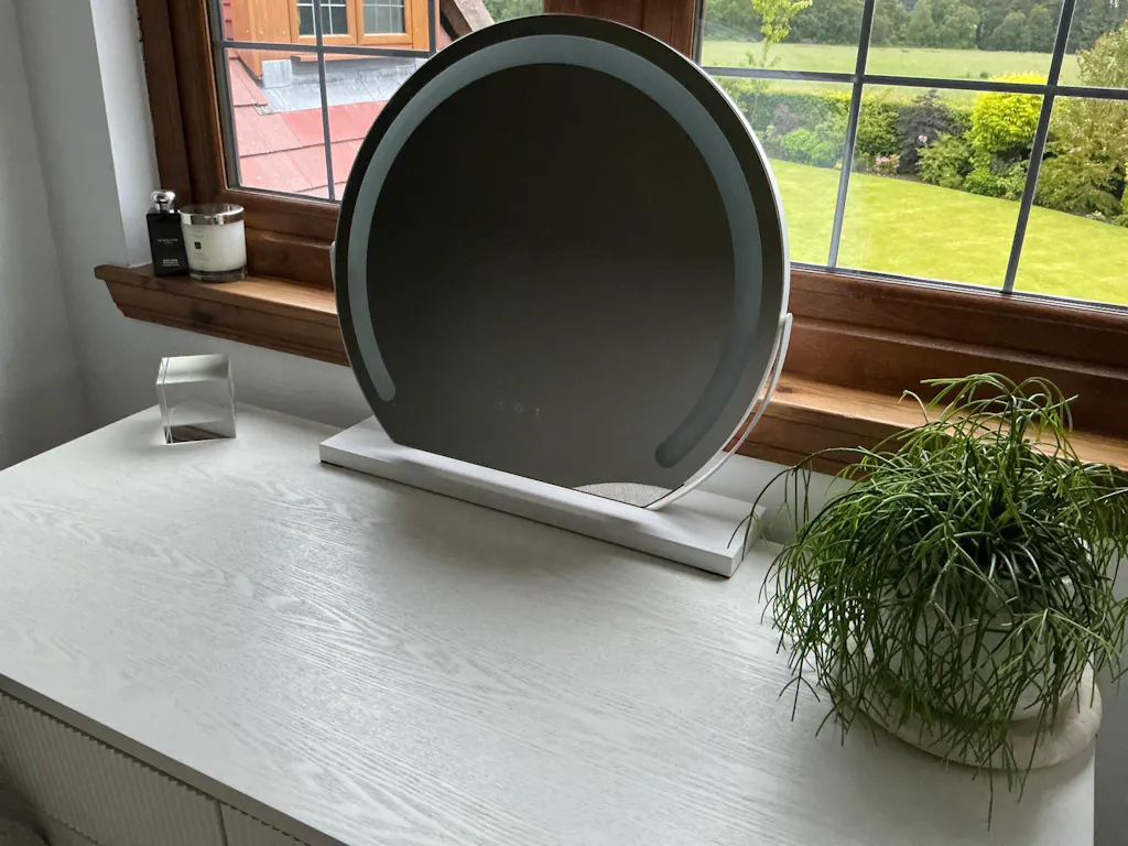 To idealne lustro do makijażu! Pasuje na toaletkę, a kiedy nie używam – wygląda uroczo. Różne tryby światła i możliwość regulacji jasności idealne do dopasowania. Bez żadnych zastrzeżeń, świetne!